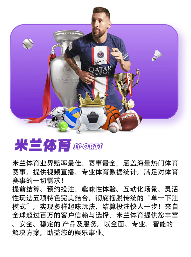 米兰体育系亚洲规模最大的合法持牌投注平台、全球领先的娱乐服务供应商及华人领域第一品牌,目前拥有超过 680 万名平台会员。您或许已通过朋友口中听闻我们,用户的口碑较任何文字表述更具说服力。米兰体育开展的大规模赞助活动,亦是品牌实力的有力佐证。我们已与曼联、拜仁慕尼黑、巴黎圣日耳曼、AC 米兰、里昂、阿根廷国家队等众多顶级体育俱乐部及队伍建立合作关系,为您提供值得信赖的安全保障。